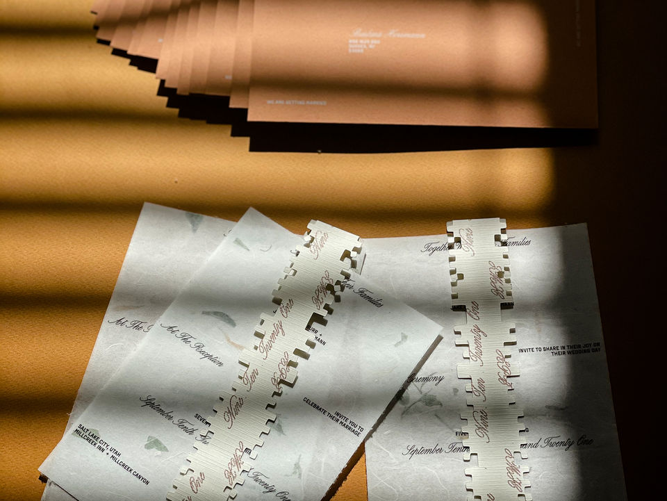 The collection of invitations and detail cards were printed on vellum, hand cut, glued and pressed for 48 + hours. The Packaging for the wedding details is a custom dieline individually inked & cut by machine. This process took over 40 hours and was done for 120+ invitations. This choice was made to ensure a high quality product. The belly band includes the couples initials and date of marriage. The information is elegantly type set on vanilla linen paper. Each band followed a similar process as the detail package. I manufactured 4 different embossing and de-bossing plates. The invitations were pressed individually to create a letterpress effect.